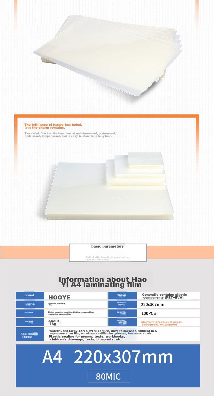 HOOYE Plastic Film is a high-quality laminating material made of PET and EVA, providing excellent protection against moisture, dust, fading, and water. It is suitable for various documents and photos, ensuring long-term preservation and durability.