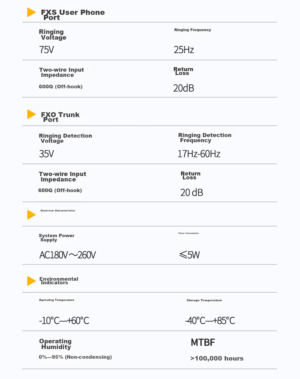 - FXO Trunk Port: Ringing detection voltage 35V, Ringing detection frequency 17Hz-60Hz, Impedance 600Ω