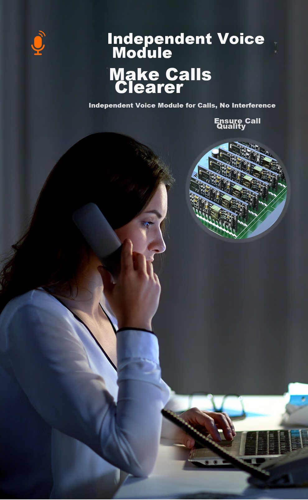 **Additional Features:** Independent voice module for clearer communication, separate from telephone line to ensure call quality. Environmentally friendly design with natural heat dissipation, matte steel casing, fanless design for low noise, low power consumption, and eco-friendliness.
