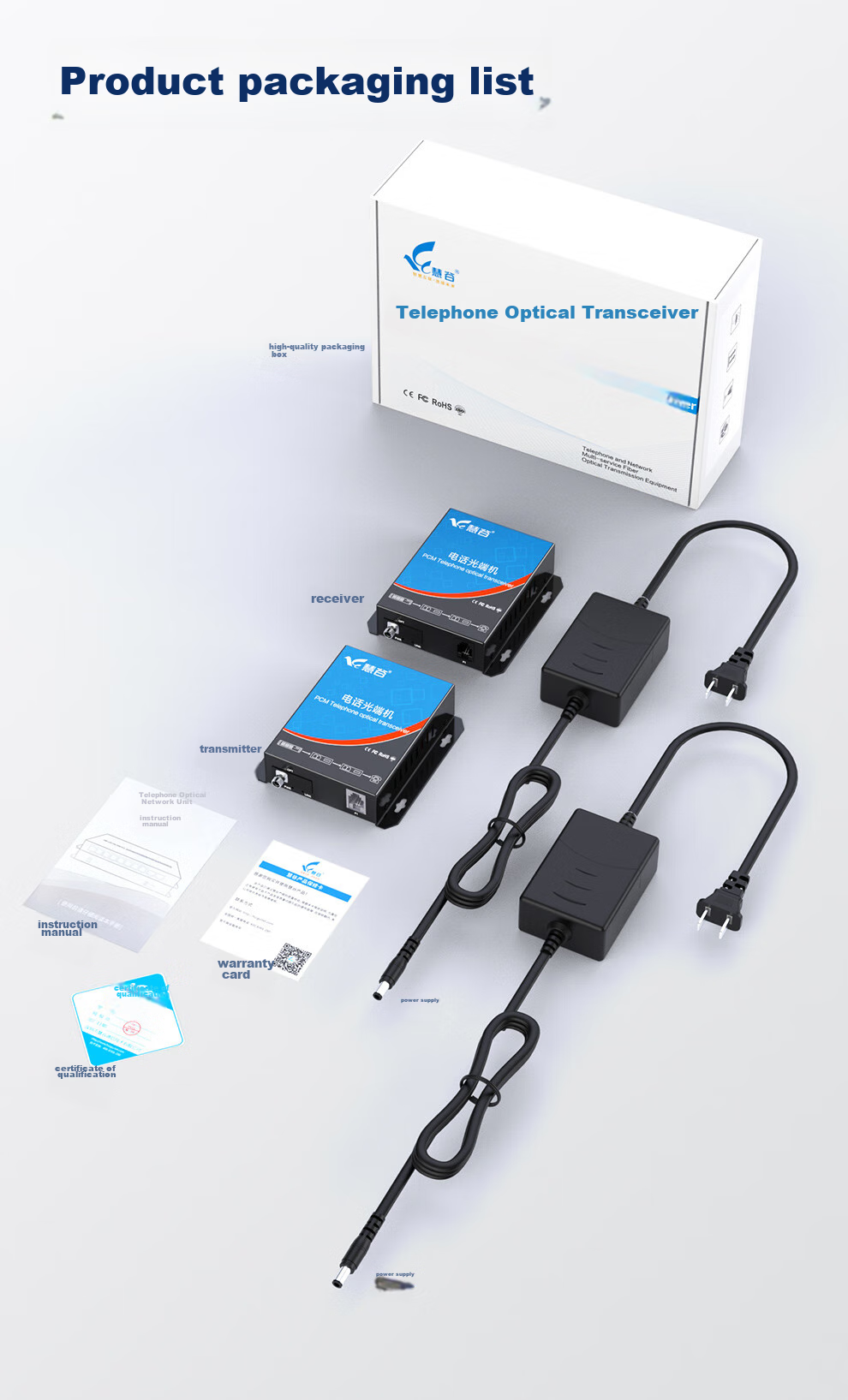 **Packaging:** High-quality packaging box with CE, FCC, RoHS certifications. Includes receiver end, transmitter end, telephone optical transceiver, user manual, warranty card, compliance certificate, power supply.