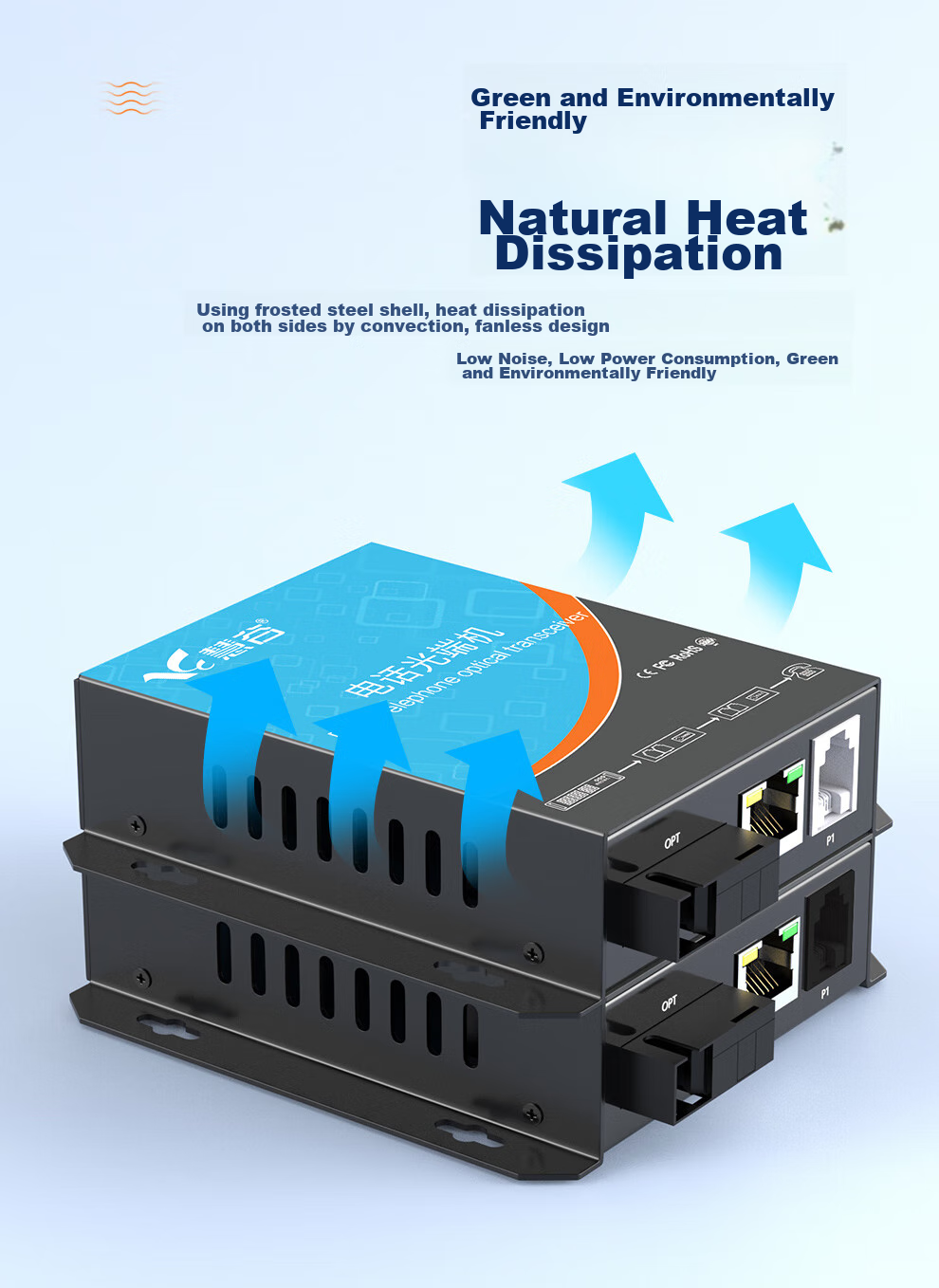 Environmentally friendly design with natural heat dissipation, matte steel casing, fanless design for low noise, low power consumption