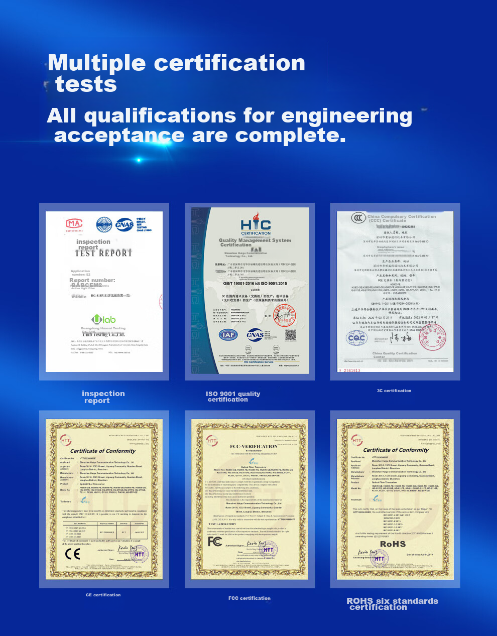 Multiple certifications including CCC, MA, ISO9001, 3C, FCC, RoHS, CE