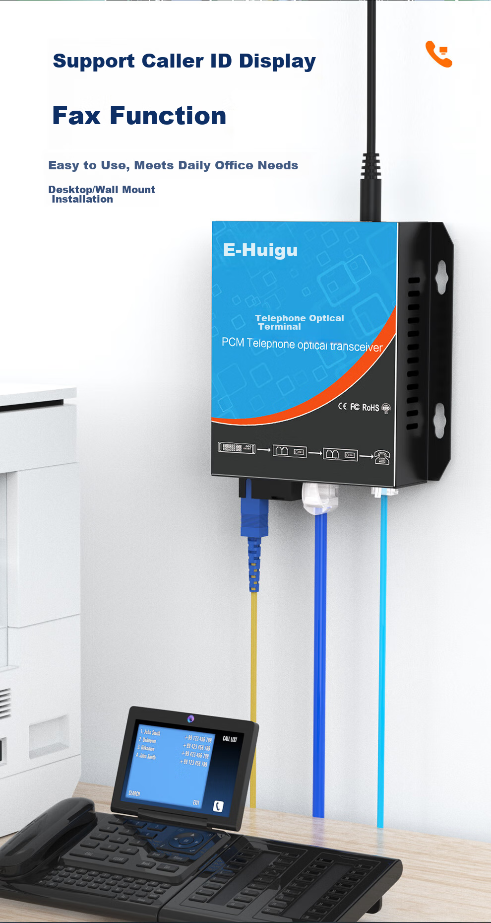 Caller ID display, fax function, noise reduction chip, plug and play, anti-interference design, clear sound quality, metal body, desktop/wall mount installation