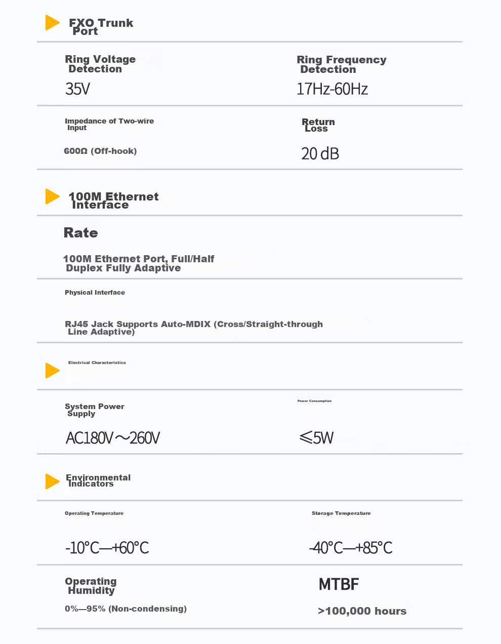 FXO trunk port with ring voltage detection, ring frequency detection, 100M Ethernet interface with auto-adaptation