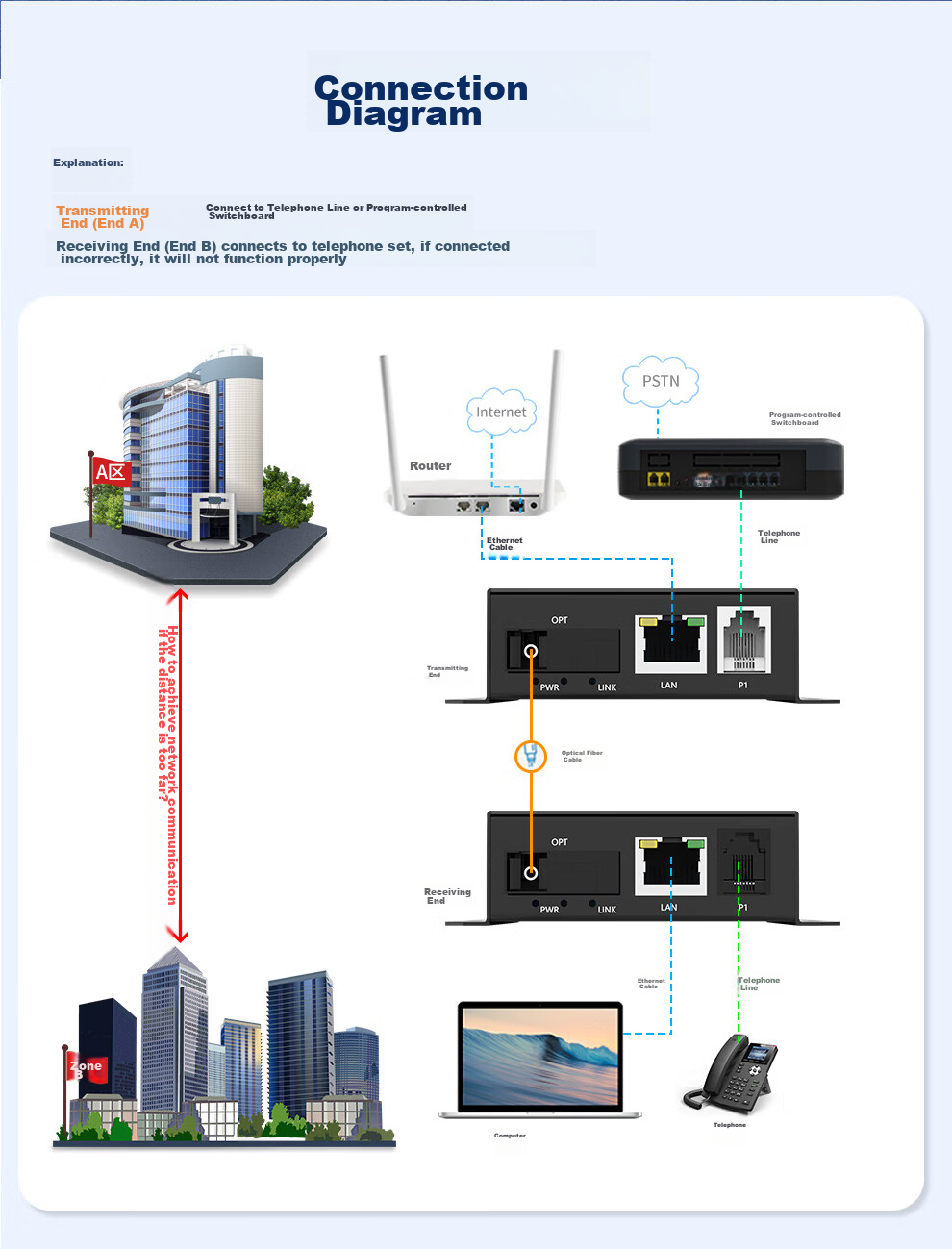Connection diagram: A-end (transmitting end) connects to telephone line or PBX, B-end (receiving end) connects to telephone set