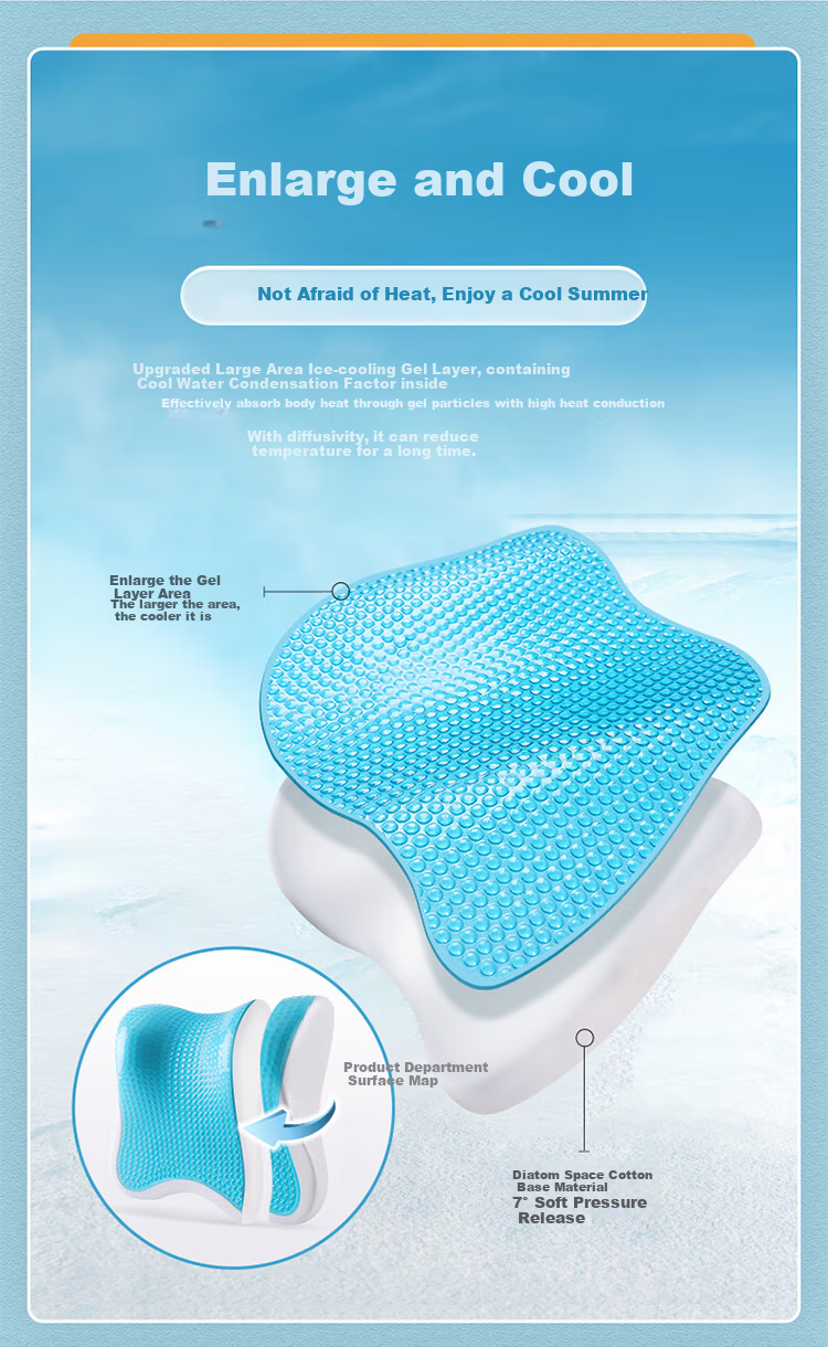 **Pressure Relief:** Liquid gel material with hundreds of gel droplets and dozens of air channels for cushioning and shock absorption, conforming to neck and waist curves.