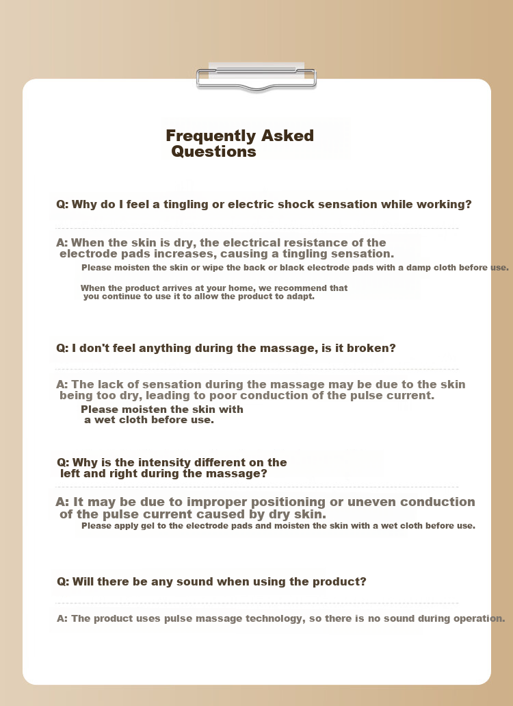 A: Dry skin can increase the resistance of the electrode pads, causing a tingling sensation. It is recommended to moisten the skin before use.