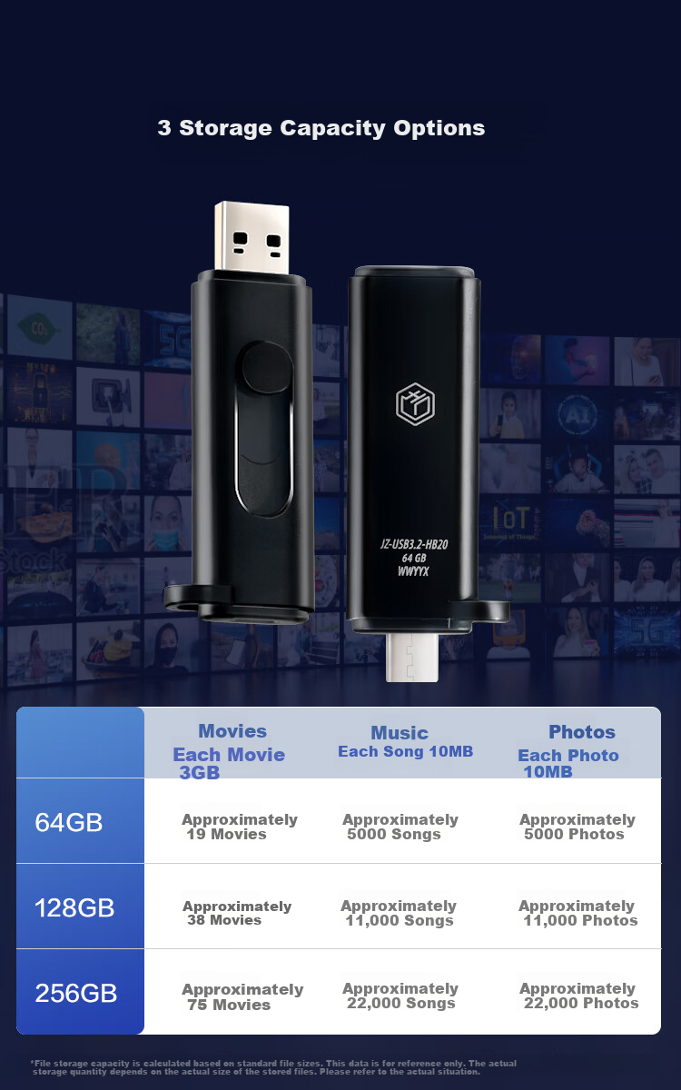 Ideal for storing movies, music, and photos with approximate storage capacities provided