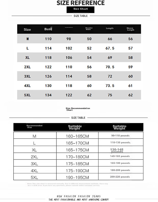 - 5XL: Height 190-195cm, Weight 200-220lbs