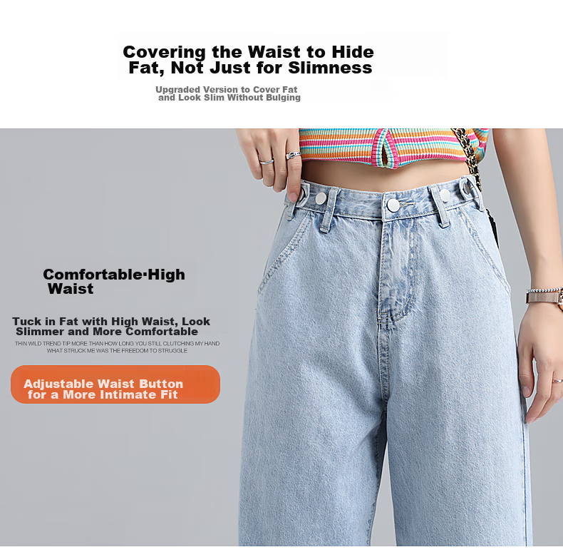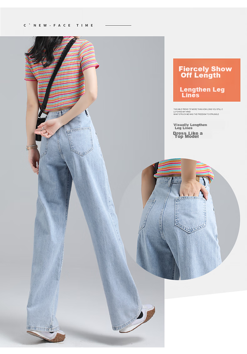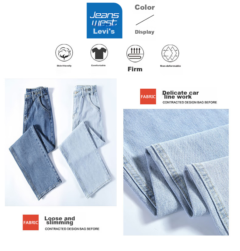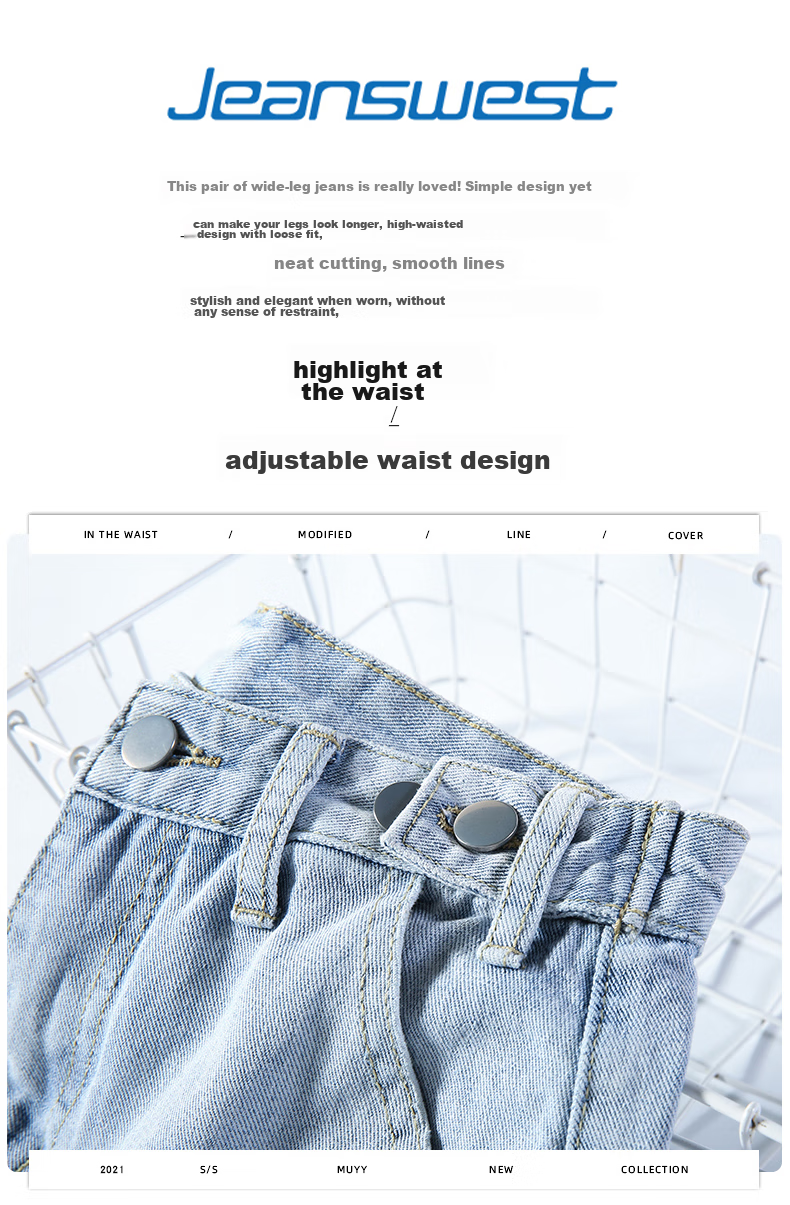 JEANSWEST's New Fashion Wide Leg Jeans are designed to be both stylish and slimming, featuring a high waist and a loose fit that flatters various body types. The adjustable waist design allows for a customized fit, while the wide leg style elongates the legs and provides a slimming effect. Made from a lightweight fabric, these jeans are perfect for the Spring season. With attention to detail and quality craftsmanship, these jeans are a must-have for anyone looking to showcase their style and silhouette.