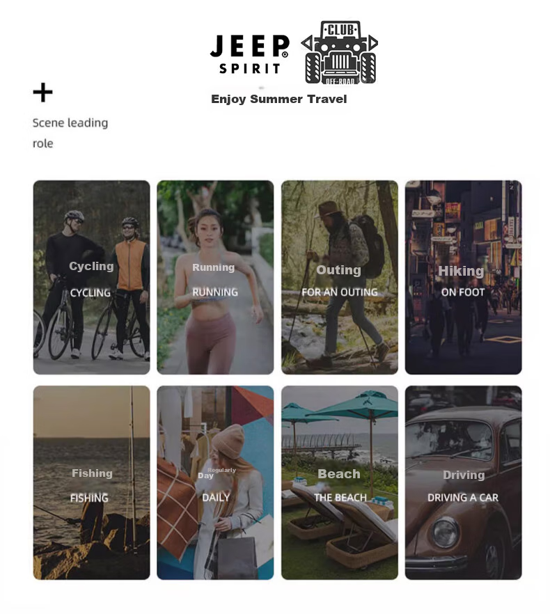 **Description:** JEEP SPIRIT is a young brand extension under the JEEP brand, continuing the outdoor leisure style of JEEP but emphasizing a more modern and free-spirited American casual style for young people who are passionate about the outdoors, close to nature, and seek relaxation.