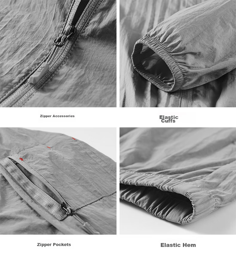 **Product Details:** Sunshade hat, collar stitching, elastic cuffs, zippered pockets, elastic hem, back print, arm pocket