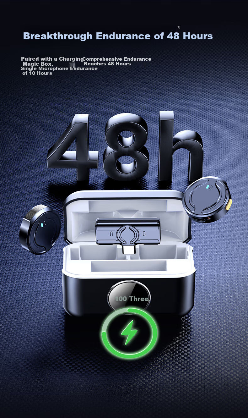 **Battery Life:** Up to 48 hours with charging case, 10 hours for single microphone