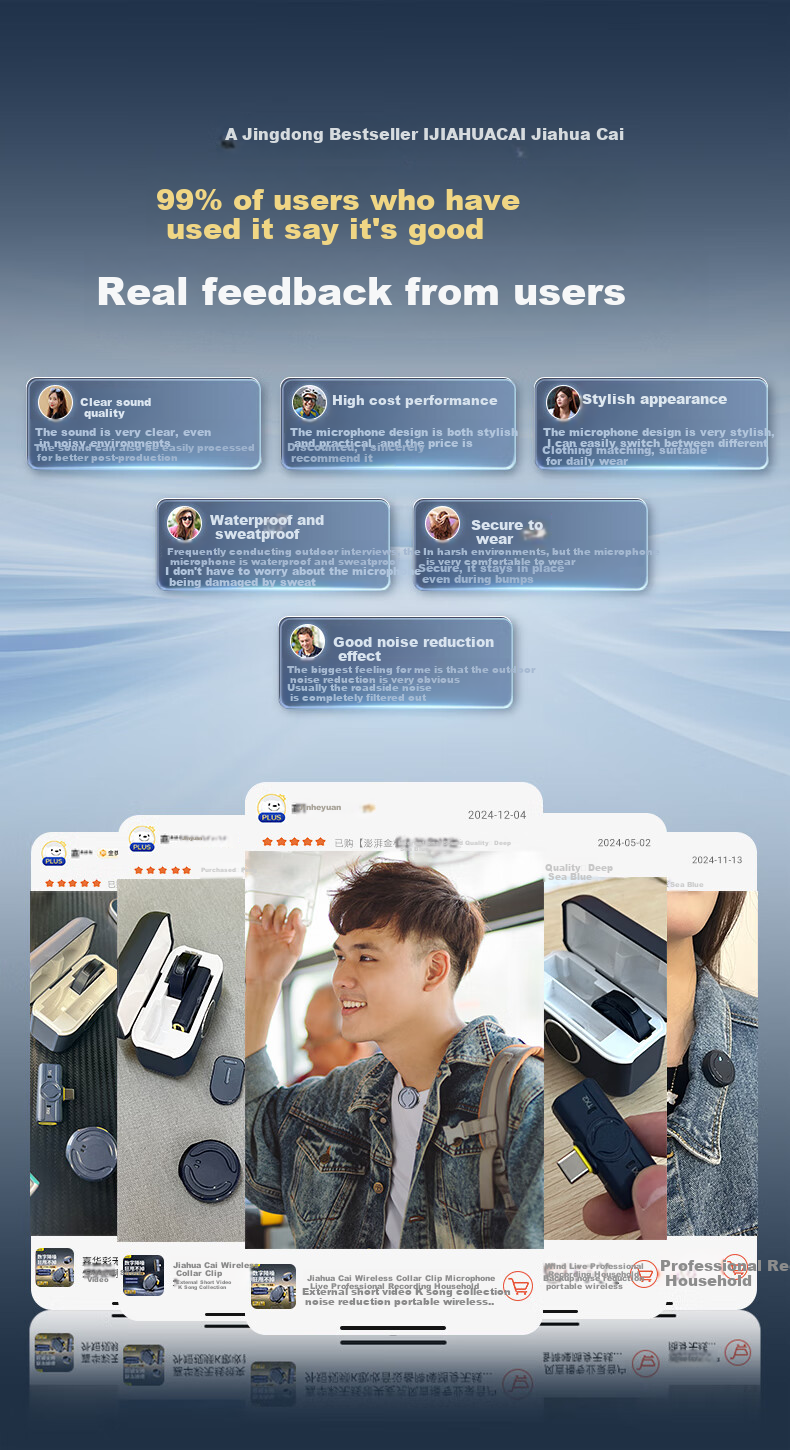**Features:** Wireless clip-on microphone, noise reduction, suitable for live streaming, professional recording, vlogging, meetings, and more