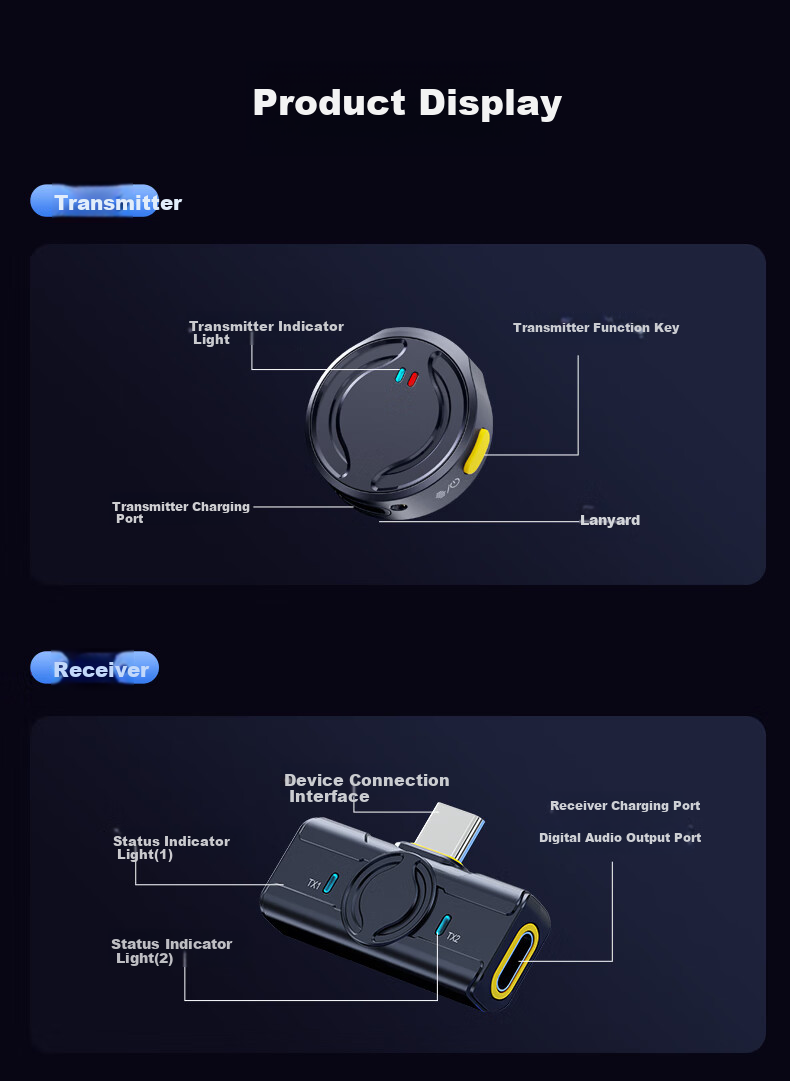 **Accessories:** Transmitter, transmitter indicator light, transmitter function button, transmitter charging port, clip-on receiver, device connection interface, receiver charging port, status indicator lights, digital audio output port