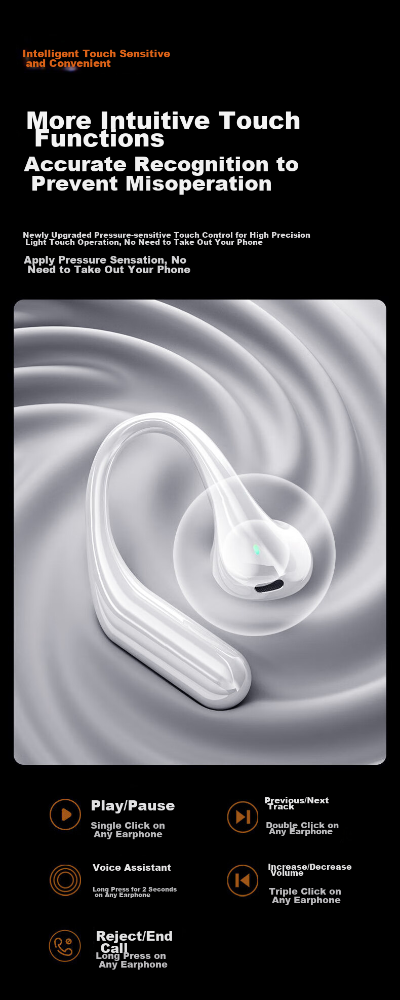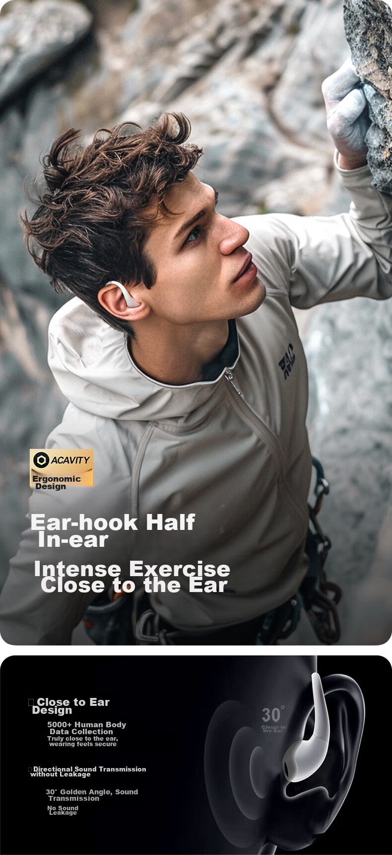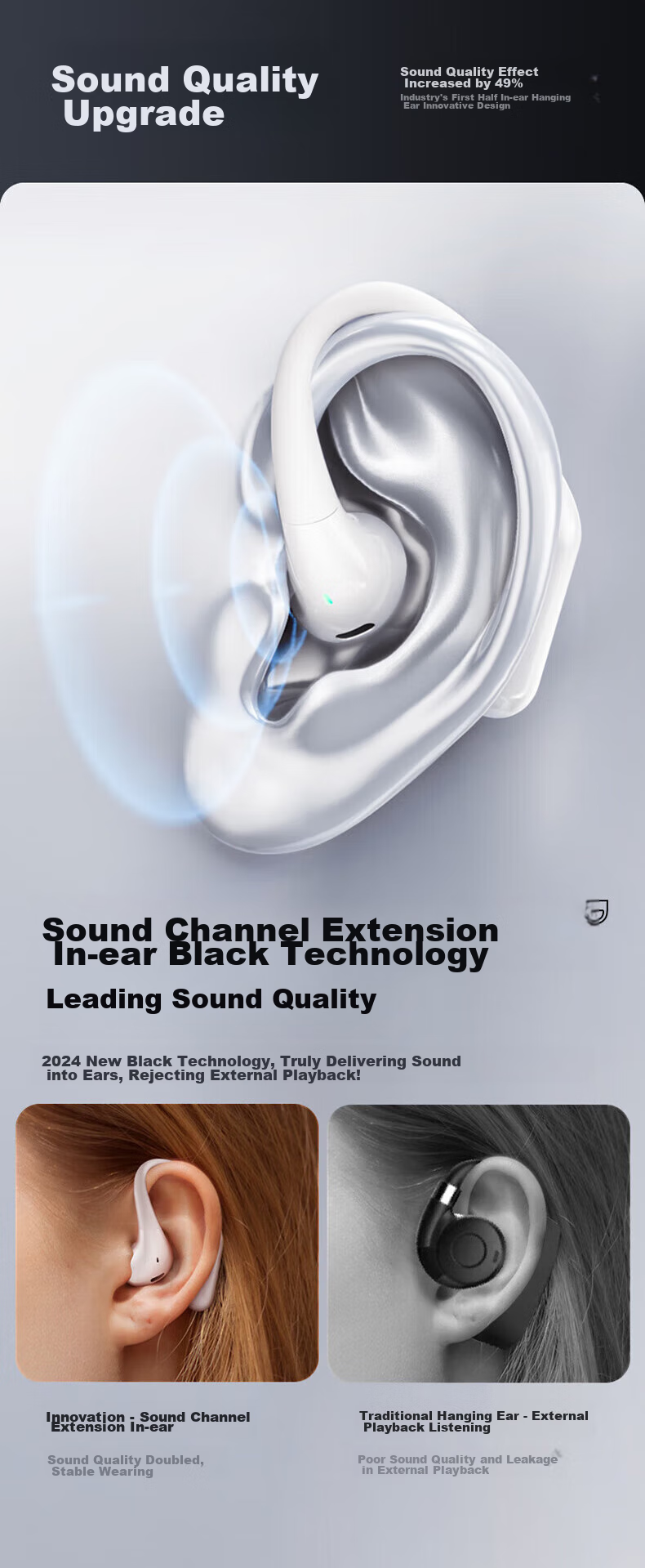 **Innovations:** Half in-ear and ear-hook design for improved sound quality and comfort