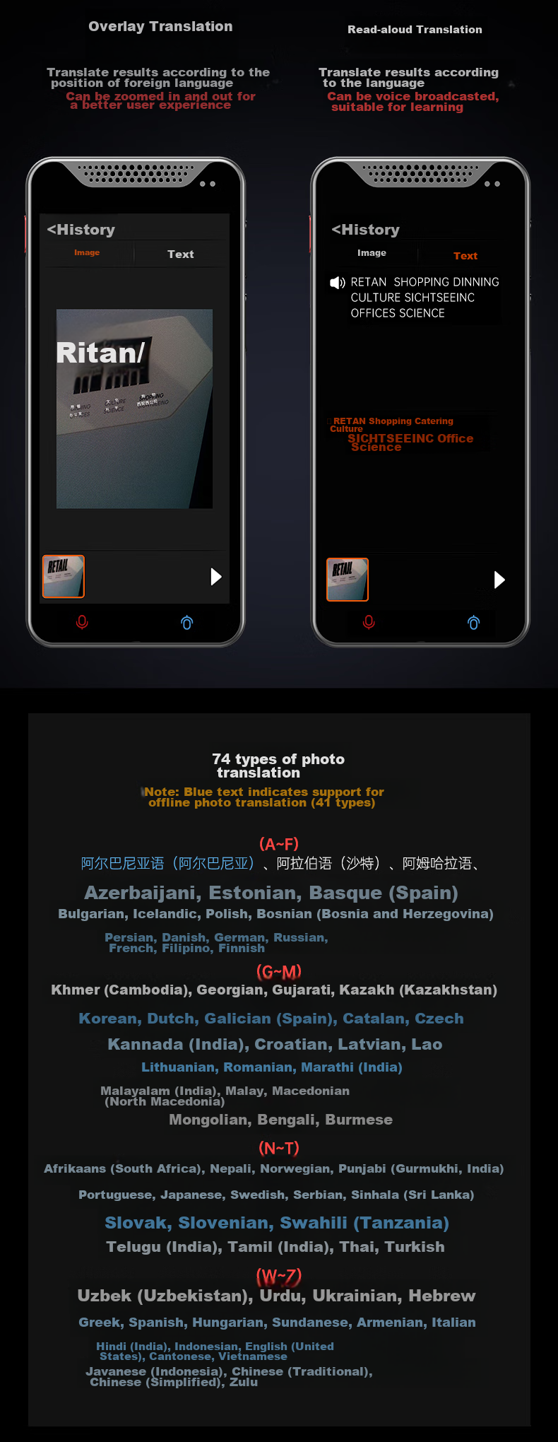 **Offline Translation Languages:** Arabic, German, Russian, French, Korean, Japanese, Thai, Spanish, English, Vietnamese, Italian, Portuguese, Dutch, Hindi, Indonesian, Cantonese (Traditional), Cantonese (Simplified), Turkish, Chinese (Traditional), Chinese (Simplified), and more.