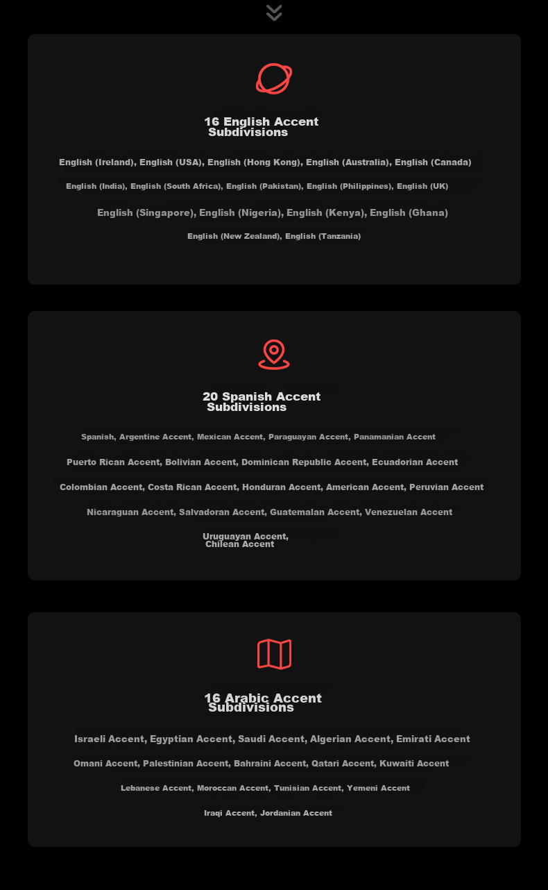 **Accent Translation:** Supports 137 countries' accents, including 16 English accents, 20 Spanish accents, and 16 Arabic accents