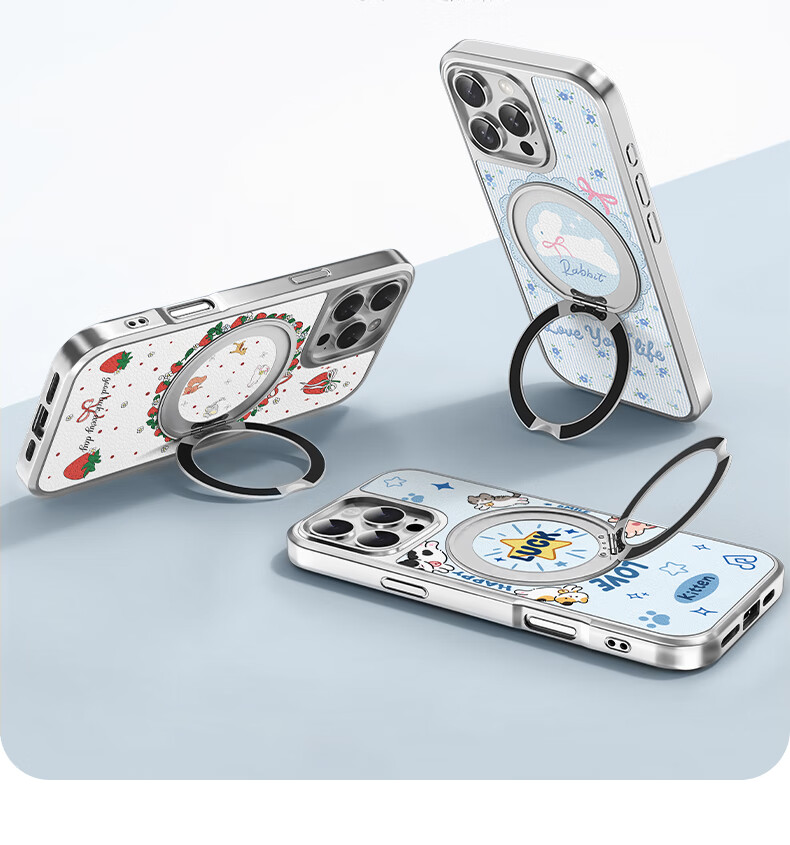 Kerimun Magnetic Absorption Ring Holder Stand iPhone 16 Pro Max Case Apple 16 Pro Max Protective Cover Anti-drop Heat Dissipation Leather High-end Cute Girls - Blue Flower Little Rabbit