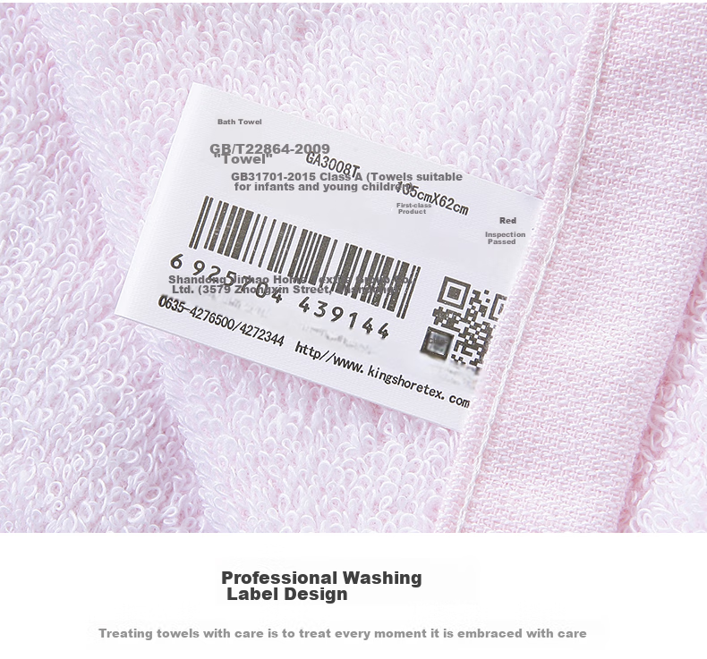 **Bath Towel Specifications:** Complies with GB/T22864-2009 and GA3008T standards. Also meets GB31701-2015 Class A requirements suitable for infants. Dimensions: 135cm x 62cm. Grade A quality in red color. Certified and labeled with 6925704439144. Manufactured by KING SHORE Home Textile Group Co., Ltd. located at 3579 Zhongxin Street, Shandong, China. Contact: 0635-4276500/4272344. Website: http//www.kingshoretex.com.