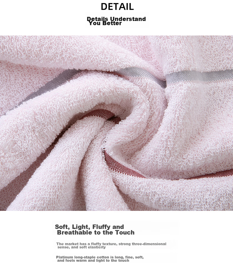 **Details:** Soft and fluffy with a luxurious feel. Features a plush and three-dimensional texture, made from long and soft platinum cotton fibers. The towels are gentle on the skin and lightweight. The exquisite satin finish adds a touch of elegance and showcases a subtle lifestyle. High quality both inside and out.