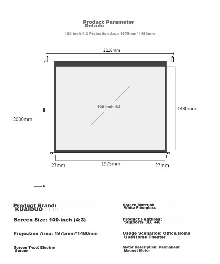 - **Screen Size:** 100 inches, 4:3 aspect ratio, projection area of 1975mm x 1480mm.