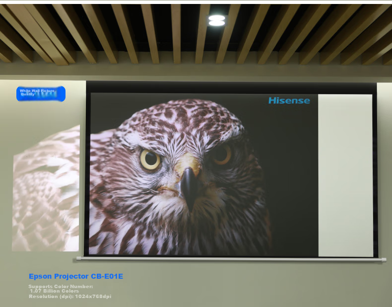 **Projection Comparison:** JMGO 14:40 VIPS film "Korean girl group Apink-Mr" projected using the XGIMI H3 projector with a brightness of 1900 ANSI lumens and a screen size of 100 inches. JMGO 14:4 4K ULTRAHD film projected using the XGIMI H3 projector with a brightness of 1900 ANSI lumens and a screen size of 100 inches. A significant difference in picture quality is observed when comparing projections on a white wall. The Epson projector CB-E01E supports 10.7 billion colors and a resolution of 1024x768dpi. The Hisense Epson projector CB-E01E also supports 10.7 billion colors and a resolution of 1024x768dpi.