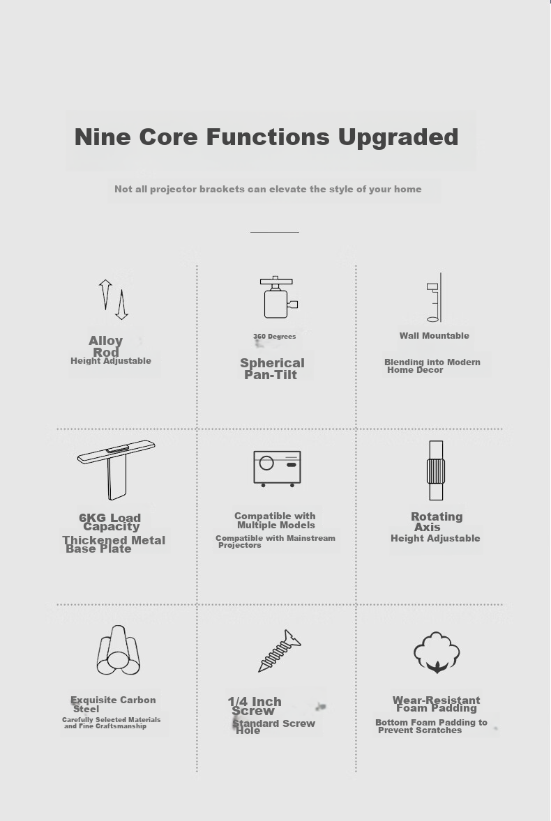 - Nine core functions including adjustable height, 360-degree rotation, wall mounting capability, and compatibility with mainstream projectors