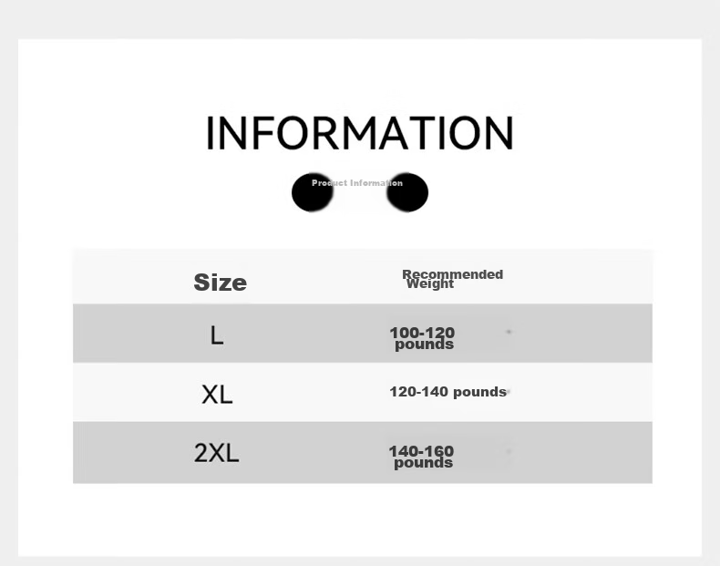 Information: Product details, sizes, recommended weight - L: 100-120 lbs, XL: 120-140 lbs, 2XL: 140-160 lbs.