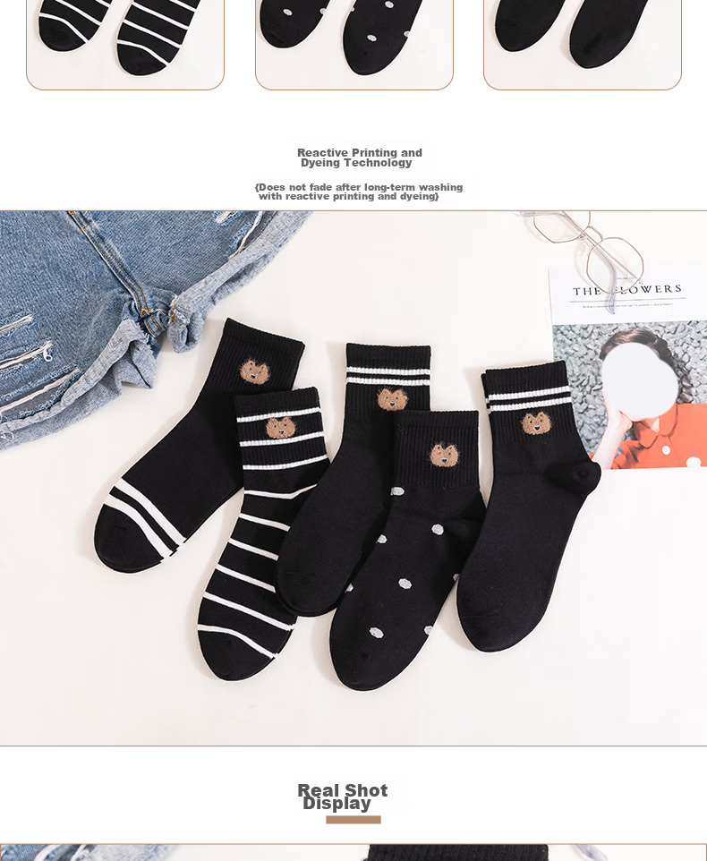 Sample Information: 100% cotton socks, 3 pairs, color as shown