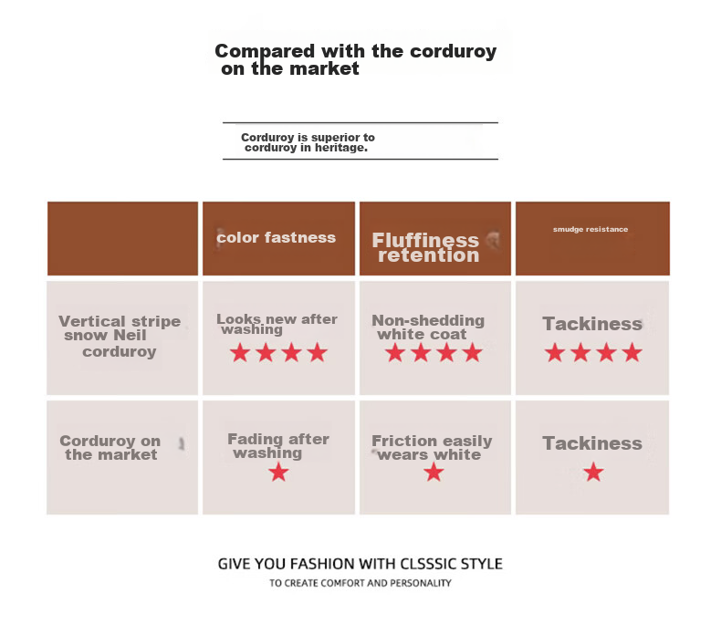 - Contrast with traditional corduroy for superior color retention and durability