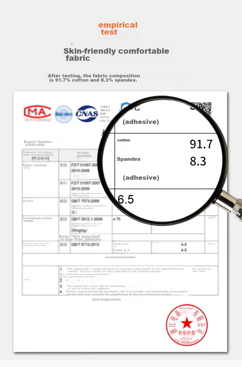 The fabric composition has been tested and certified by MA, CNAS, F6 SLA, and meets quality standards.