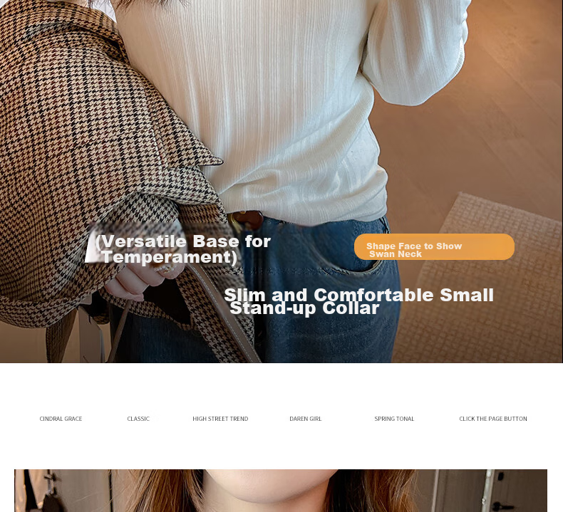 **Features:** Face-shaping to highlight swan neck, slim and comfortable small stand-up collar