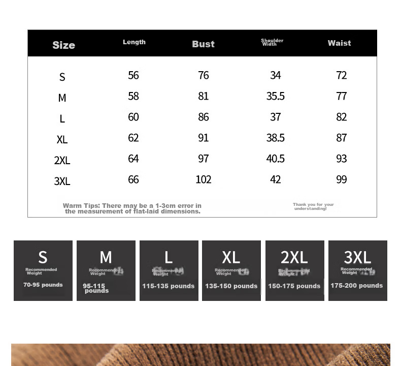 - 3XL: Length 66cm, Bust 102cm, Shoulder 42cm, Waist 99cm