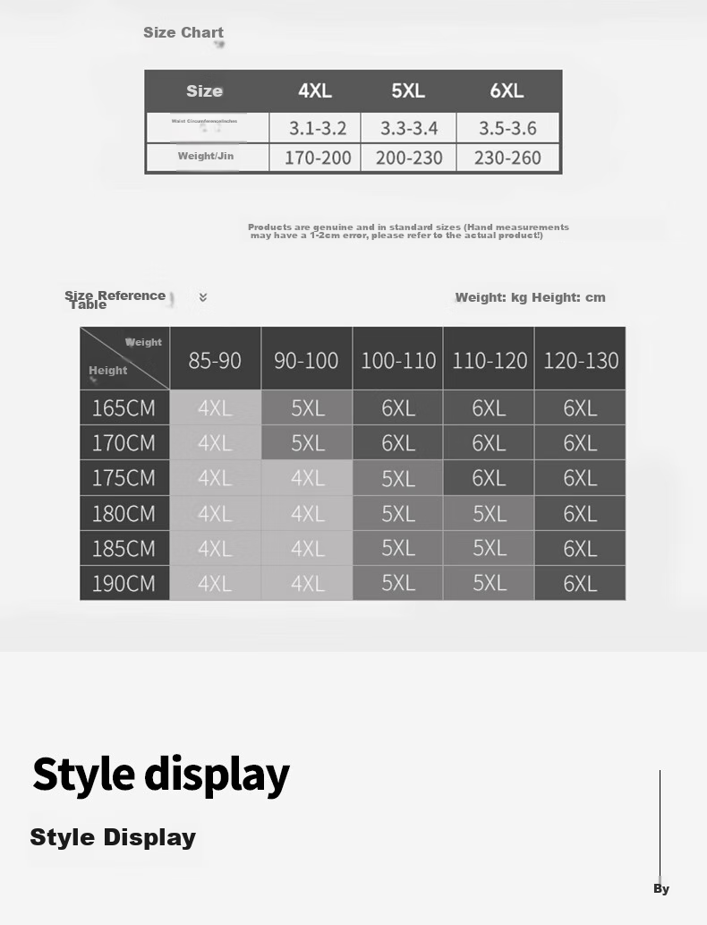 - 6XL: Waist 3.5-3.6 ft, Weight 230-260 lbs