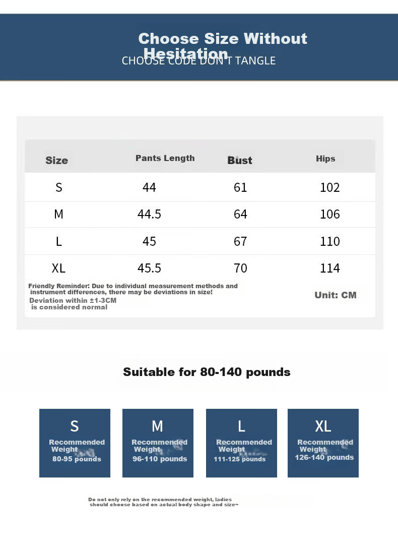 Note: Due to manual measurements, there may be a deviation of 1-3CM. Please choose the size according to your actual body shape and size, not just the recommended weight.