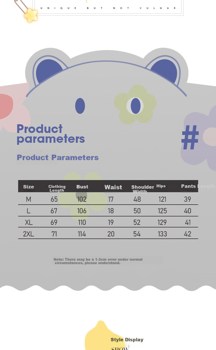 - M: Length 65, Bust 102, Sleeve Length 17, Shoulder Width 48, Hips 121, Pant Length 39