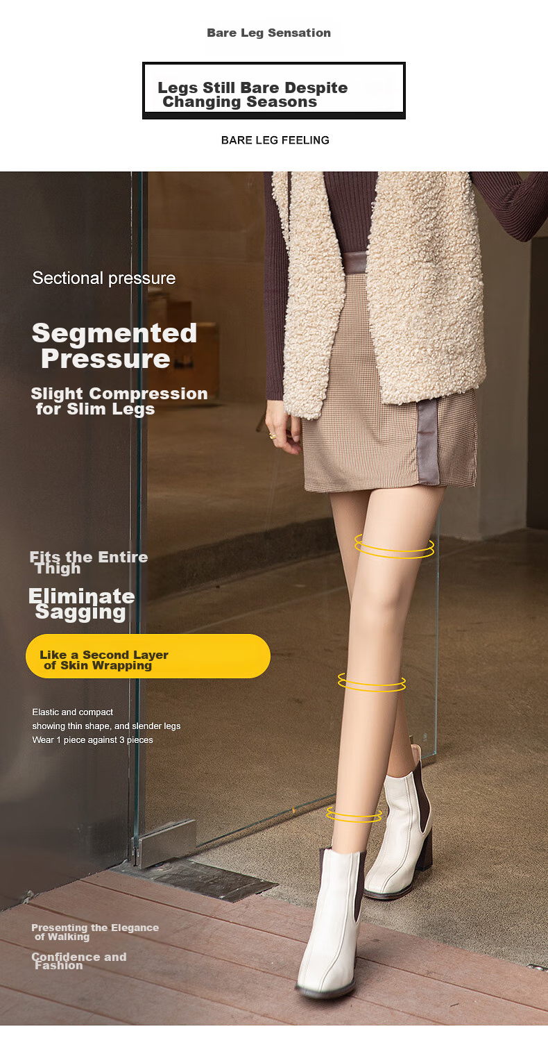 **Benefits:** Bare leg sensation, remains the same even as seasons change, BARELEGFEELING, Sectional pressure, micro-pressure slimming legs, fits the entire thigh, eliminates sagging, like a second skin layer wrapping, Elastic and compact, showing thin and slender legs, wear 1 piece against 3 pieces, presenting elegant, confident, and fashionable walking