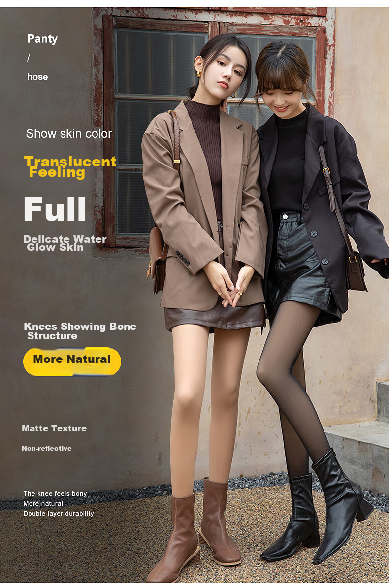 **Design:** Pantyhose, show skin color, full translucency, delicate water-glossy skin, knees showing bone structure, matte texture, non-reflective, The knee feels bony, more natural, double-layer durability