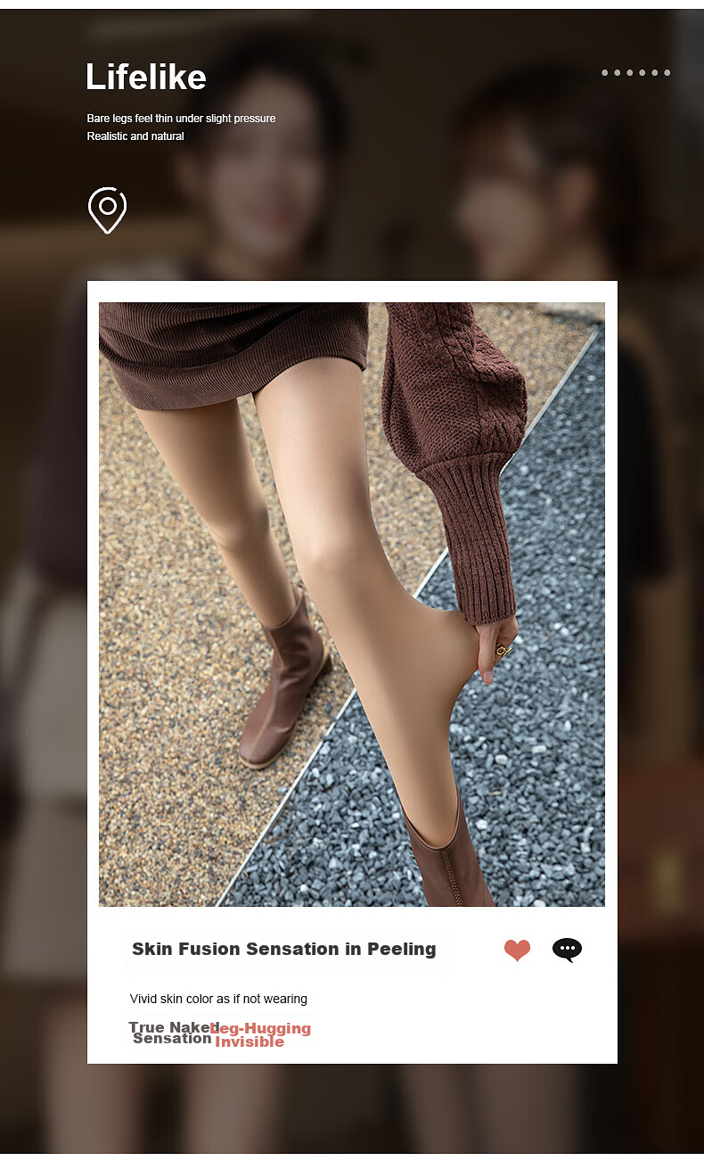 **Comfort:** Lifelike, bare legs feel thin under slight pressure, realistic and natural, feels like skin is being pulled, vivid skin color as if not wearing, truly bare leg feel, fits the leg invisibly
