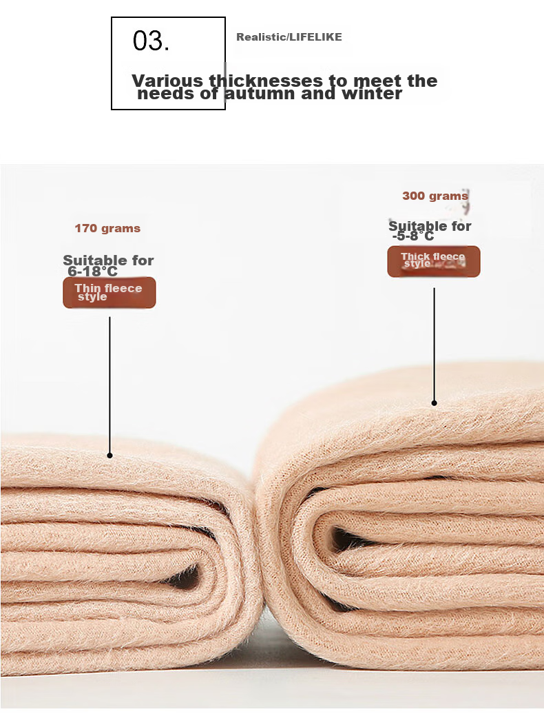 **Thickness:** Multiple thicknesses to meet autumn and winter needs, 300g, 170g, suitable for -5-8°C, suitable for 6-18°C, thick velvet style, thin velvet style