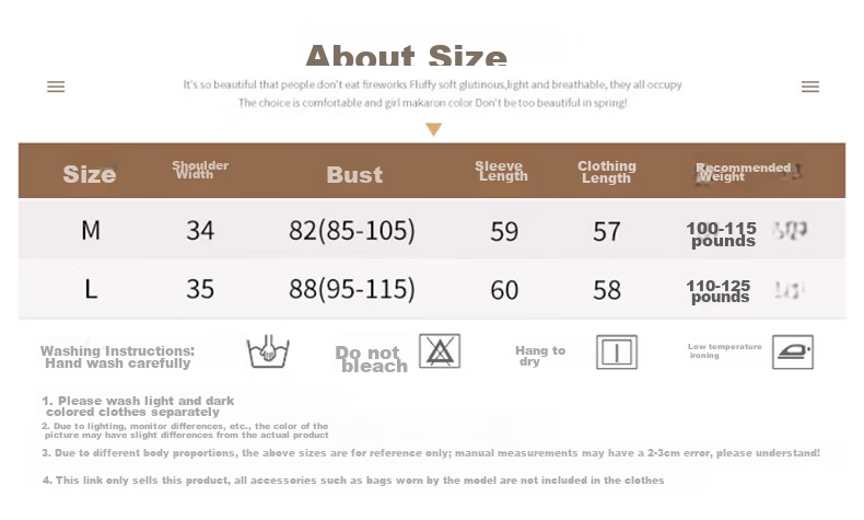 - **M:** Shoulder 34cm, Bust 82cm (85-105cm), Sleeve Length 59cm, Length 57cm, Recommended Weight 100-115 lbs