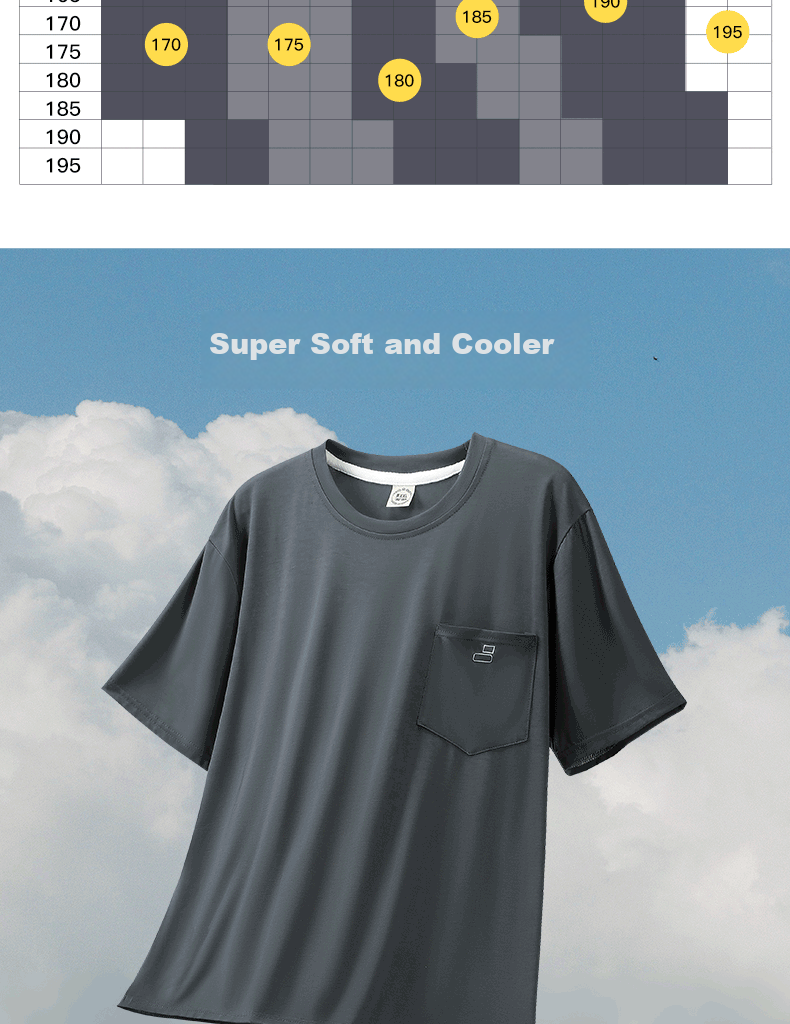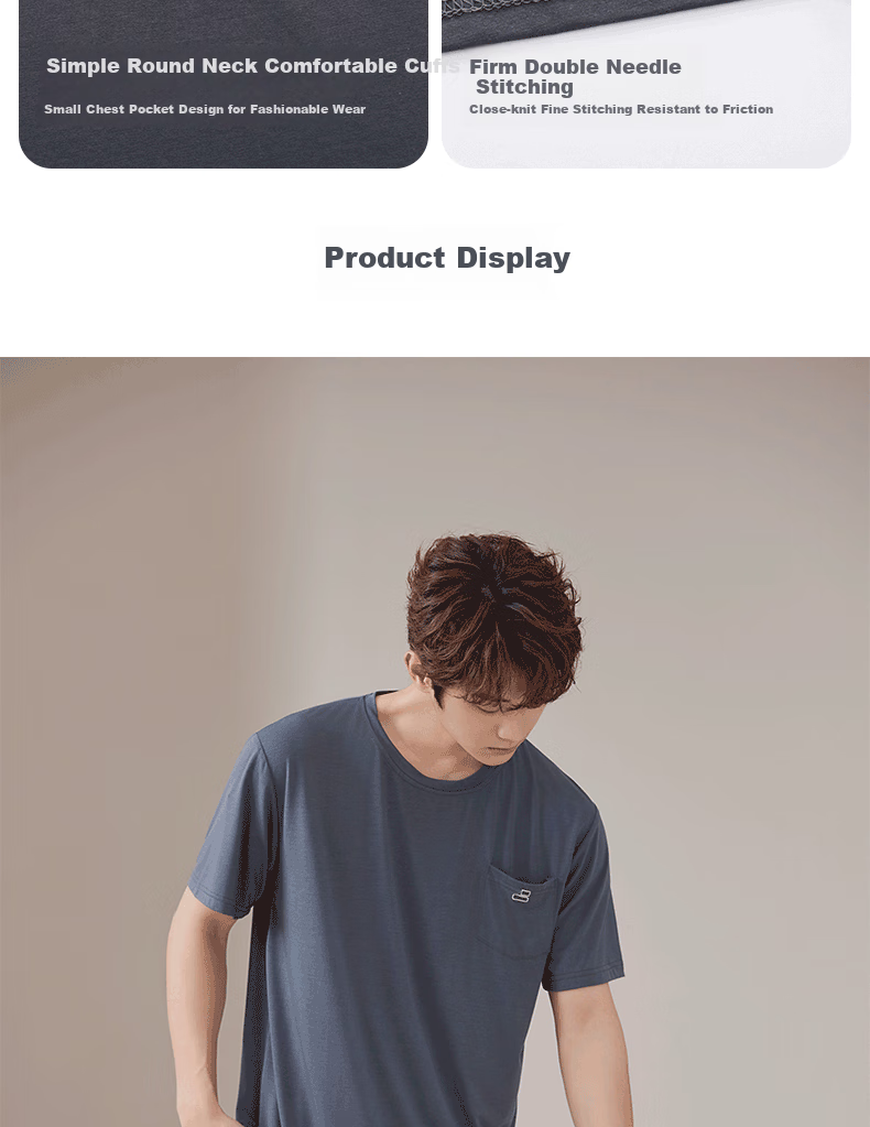Additional Details: Smooth, breathable, lightweight, high elasticity, fine cut design for waist comfort, no tightness or rolling, comfortable all day, simple round neck, comfortable cuffs, sturdy double needle stitching, stylish chest pocket design, tight and fine stitching, friction-resistant, product display.