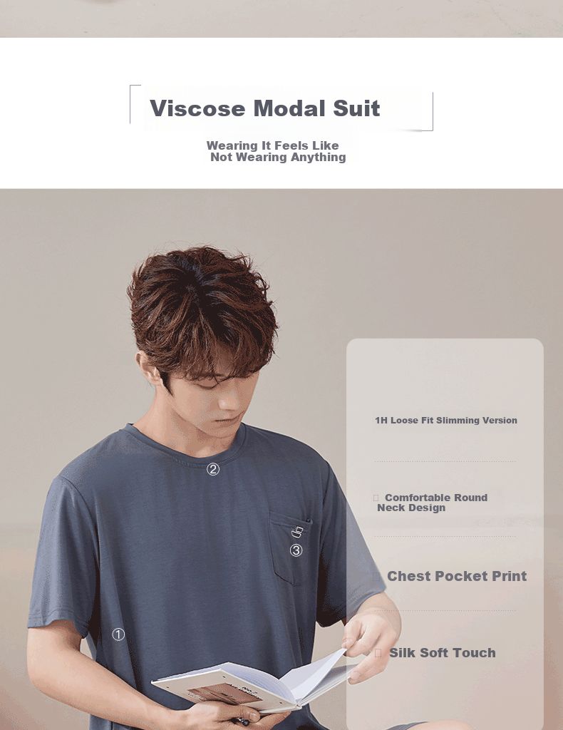 Description: Ultra-soft naked feeling for better sleep, soft+ and naked+. Modal fiber set, feels like wearing nothing, loose and slimming 1H version, comfortable round neck design, chest pocket print, silky soft touch.