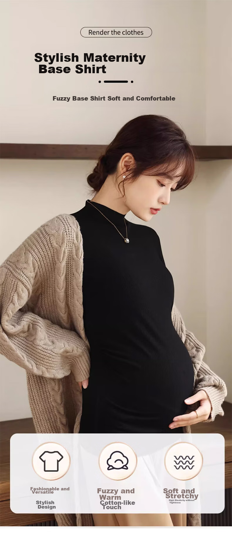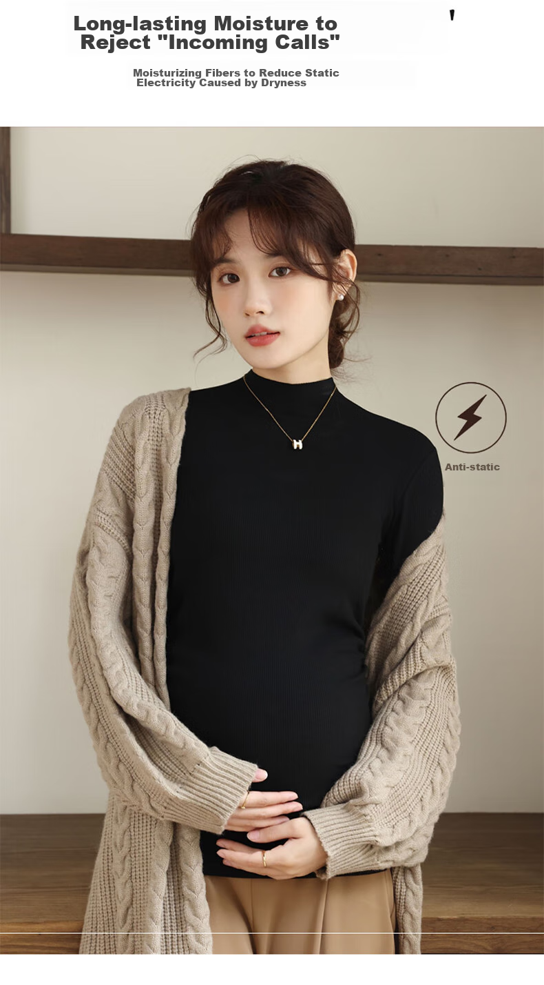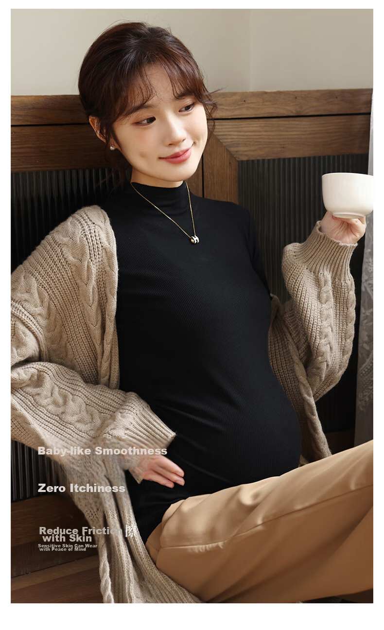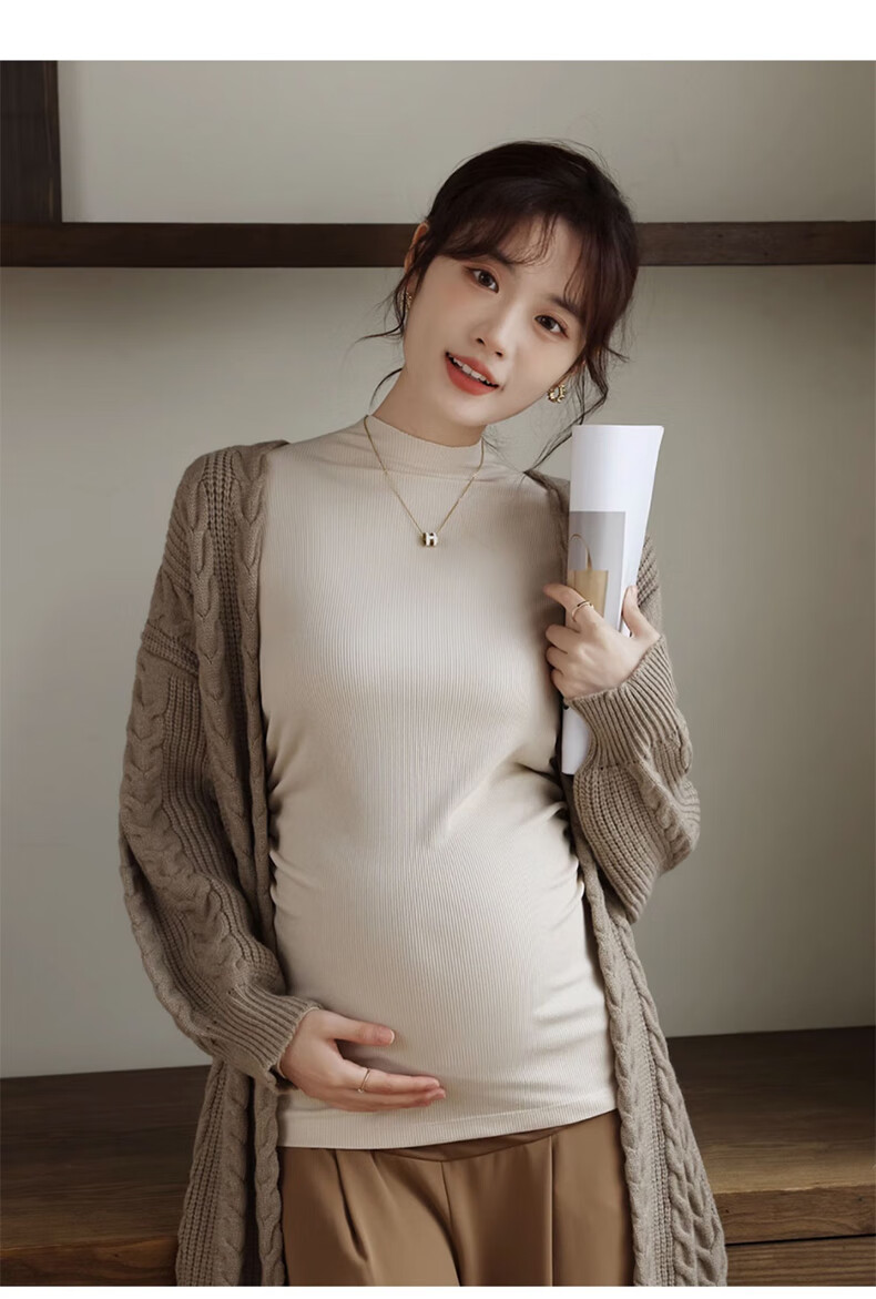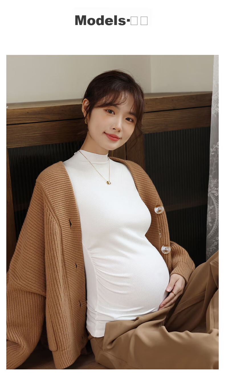 **Description:** Soft and comfortable brushed base shirt for pregnant women, versatile and stylish, providing warmth and comfort. Features a high collar design that enhances the neckline, combined with a casual drop-shoulder sleeve design for a seamless and pressure-free fit. Suitable for wearing with pants or skirts, making expecting mothers look beautiful. Can be worn as a base shirt, loungewear, or pajamas in three seasons - spring, autumn, and winter.