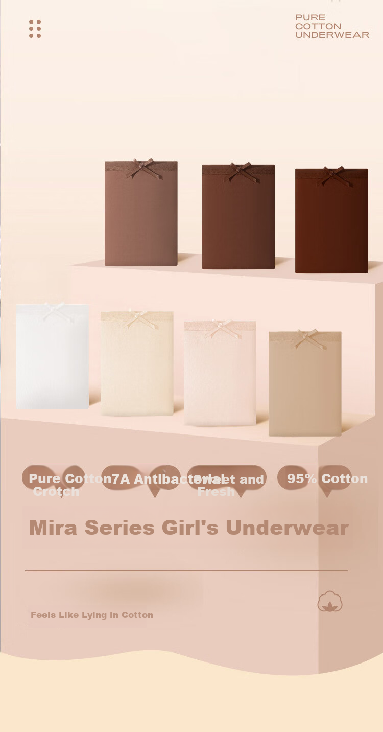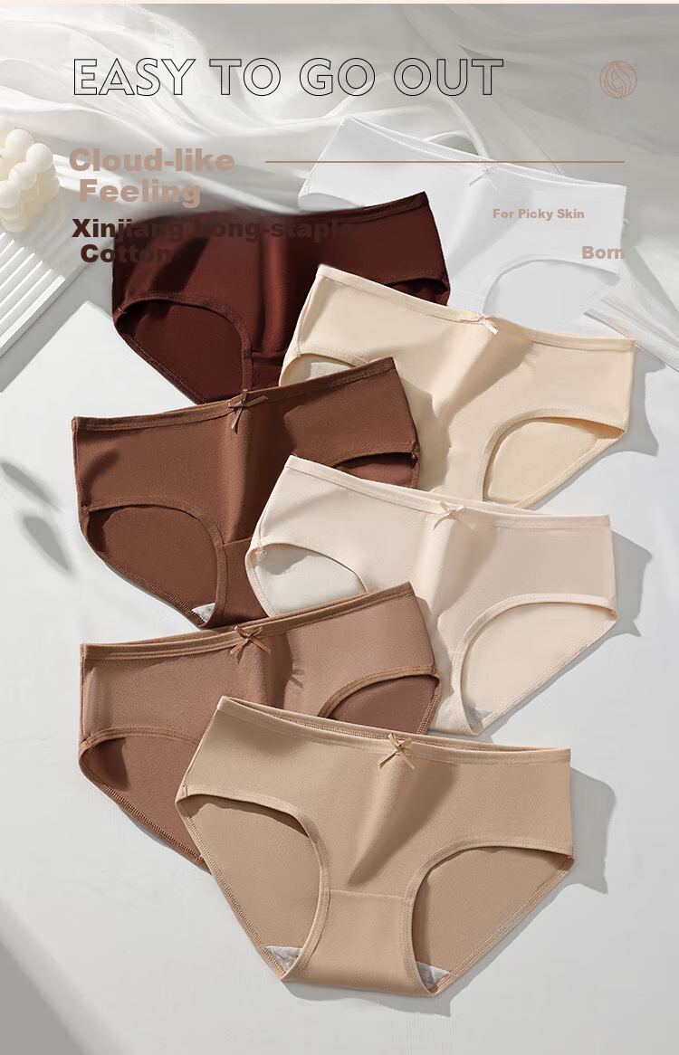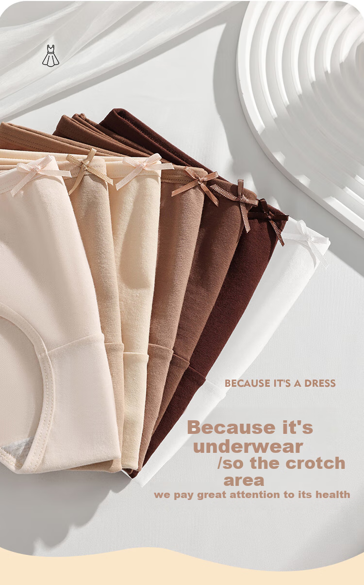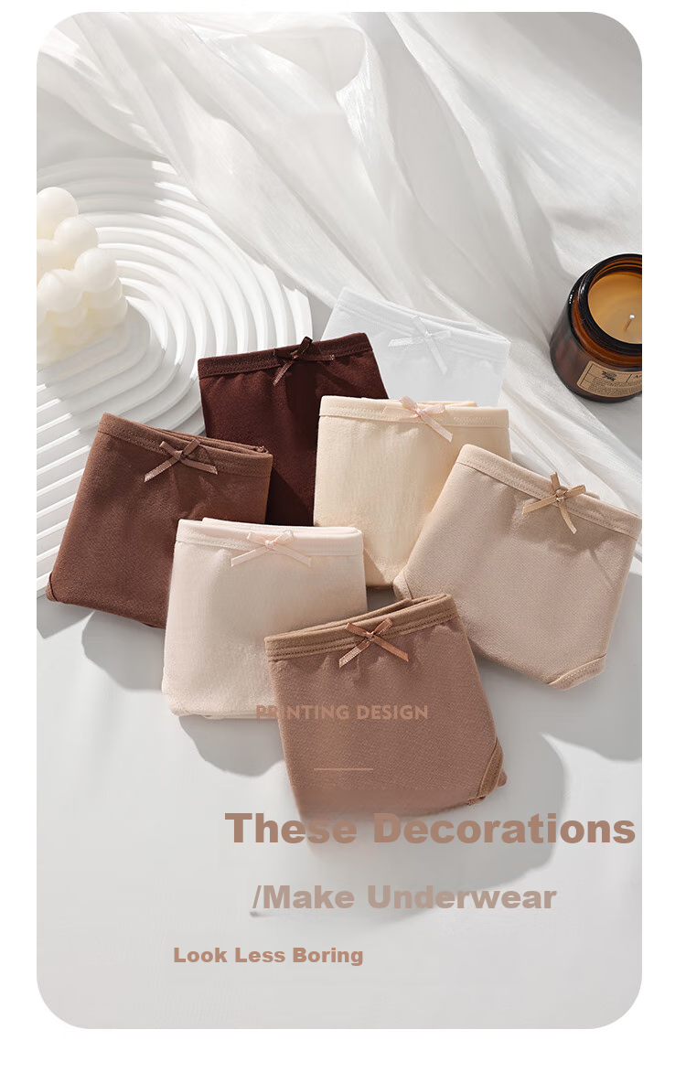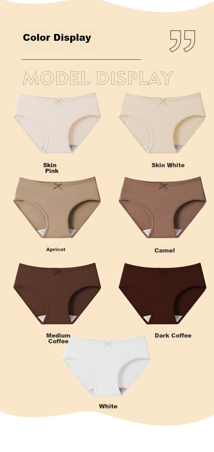 Features: 7A antibacterial pure cotton crotch, sweet and fresh design inspired by the latest fashion colors of 2024, simple design with cute bowknot, Melad series girl's panties, like lying in cotton. FLOWER/IDLE INSPIRATION. AAAAAAA antibacterial cotton crotch, breathable and not stuffy, double-layer 7A antibacterial crotch made of 100% cotton, can resist bacteria after strict washing standards up to 150 times. EASY TO GO OUT, cloud-like feel, Xinjiang long-staple cotton, created for demanding skin. PRINTING DESIGN to make the underwear look less monotonous. RUFFLED EDGE with high support, 100% Xinjiang long-staple cotton. Some details: 100% cotton stitching, sturdy and durable without tightening the waist, delicate waistband, every stitch is made with care. Pure cotton fabric sourced from Xinjiang's long-staple cotton, double-layer moisture-wicking and sweat-absorbing cotton crotch. Color options: skin pink, skin white, apricot, camel, medium coffee, dark coffee, white.
