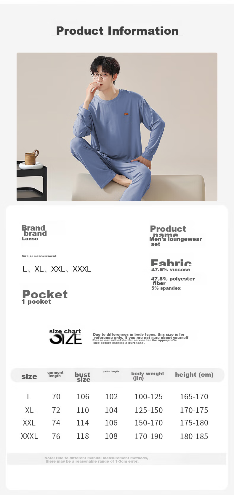 - XXXL: Length 76cm, Chest 118cm, Pants Length 108cm, Weight 170-190 Jin, Height 180-185cm