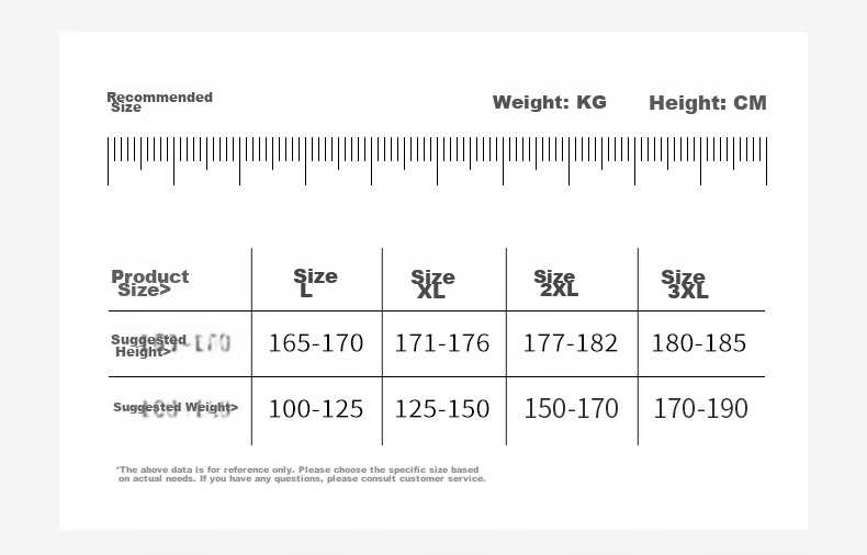 - 3XL: Height 180-185cm, Weight 170-190kg