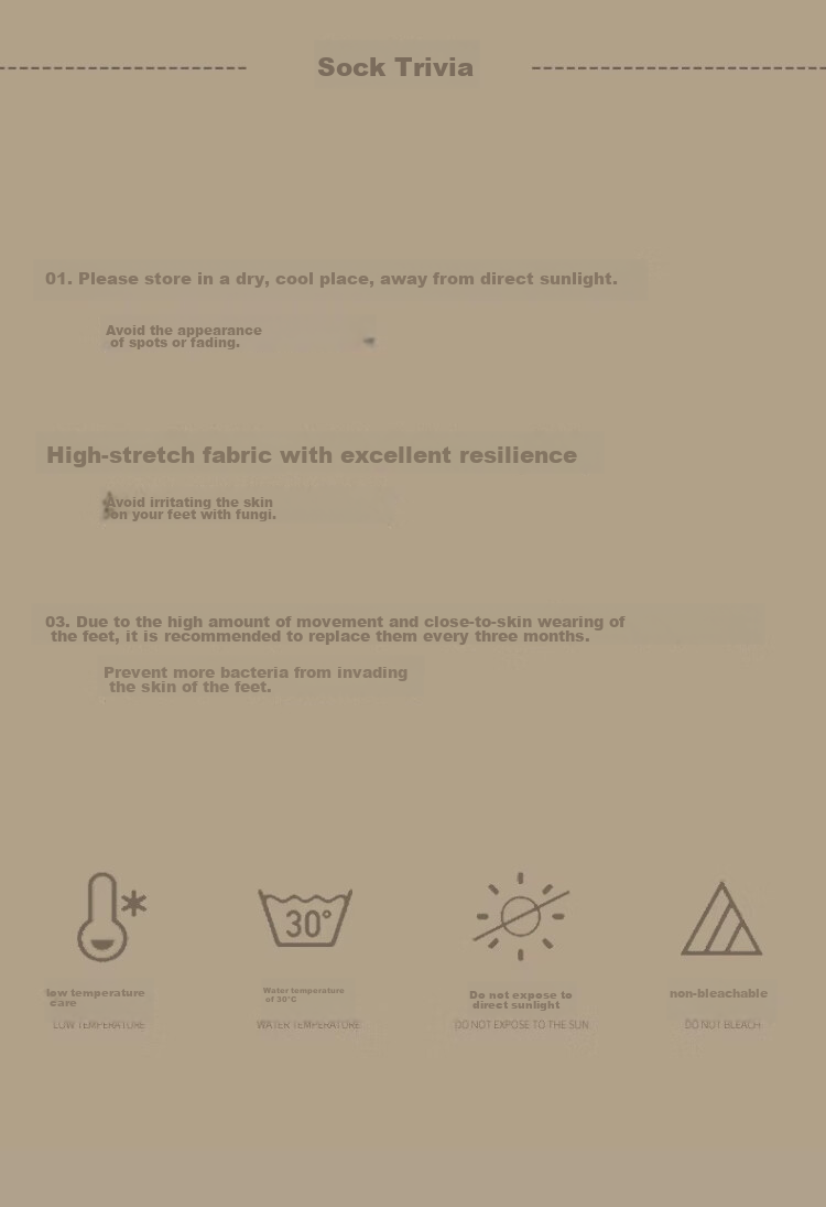 3. Due to high foot activity and close-to-skin wear, it is recommended to replace every three months to prevent skin infections. Wash in low temperature water (30°C), do not bleach, and avoid sun exposure.