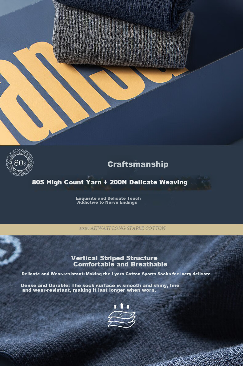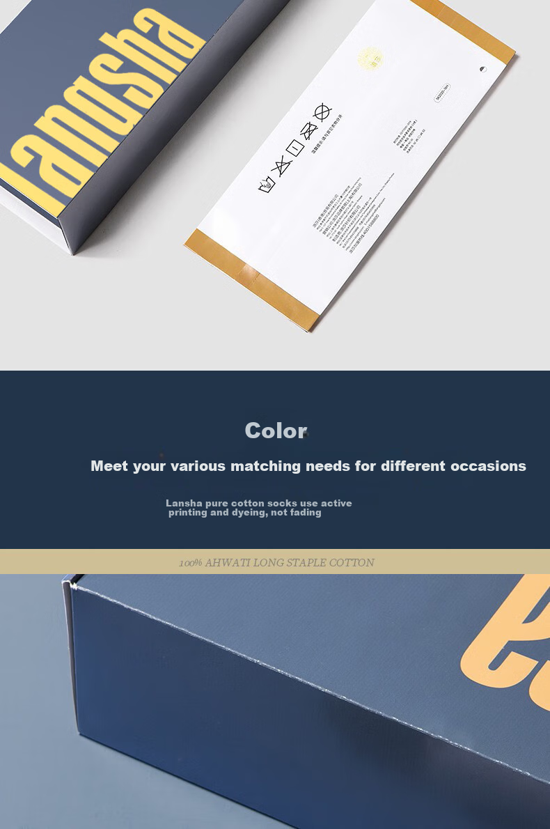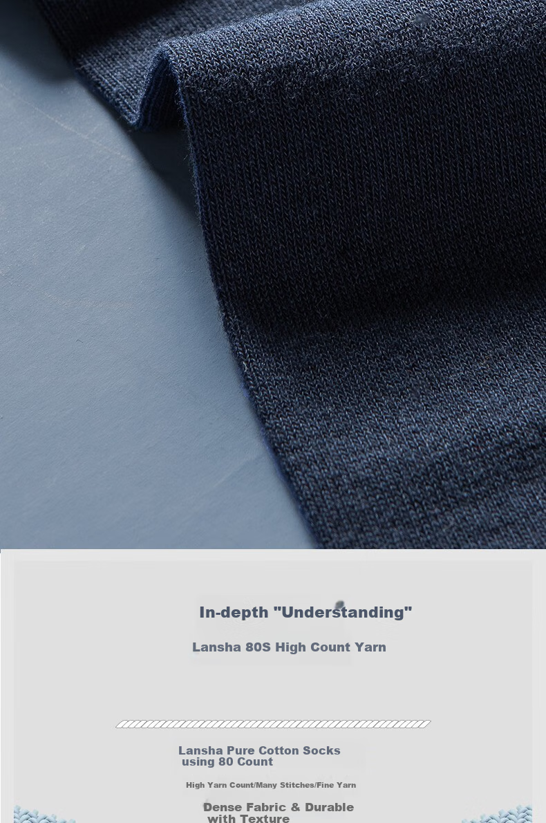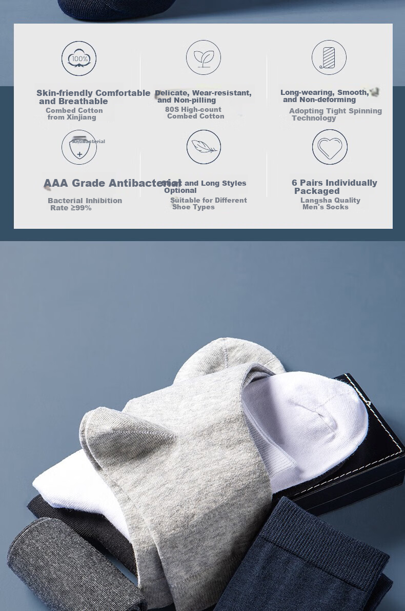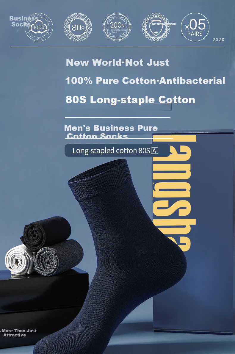 **Description:** LangSha Pure Cotton Business Socks are made from 100% AHWATI LONG STAPLE COTTON, providing a comfortable, breathable, and durable wearing experience. The socks are meticulously crafted using 80S long-staple cotton yarn and feature a high antibacterial rate. They are designed to be long-lasting, maintaining their shape and smoothness even after extended wear.